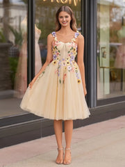 3D Flower Tulle Midi Lace-Up Back Sweetheart Neckline Spaghetti Straps Party Dresses Homecoming Dress Prom Dress