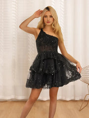 A-Line One-Shoulder Sleeveless Short With Sequins Party Dance Cocktail Homecoming Dress