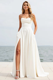 Captivating dress features an A line silhouette for a graceful and flowing fit. The strapless design exudes allure, while the sleeveless style keeps it sleek and elegant. The button back adds a classic and charming touch, and the floor length skirt, with its smooth fabric and stylish side slit, makes for a truly alluring and memorable appearance, perfect for a wedding ceremony.