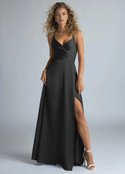 This alluring dress features an A line silhouette, offering a flowy and graceful look. The V neckline exudes romantic and gentle vibes, while the spaghetti straps add a touch of delicate and dainty style. The crisscross back detail brings a stylish and alluring element, and the floor length skirt with a high side slit creates a truly alluring and unforgettable style, perfect for bridesmaid duties.