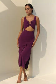 This alluring dress features a sheath silhouette, offering a sleek and body hugging look. The keyhole neckline exudes seductive charm, while the sleeveless design adds a touch of modern elegance. The open back detail brings a unique and alluring element, and the midi length skirt with a thigh high slit creates a truly alluring and unforgettable style, perfect for evening events.