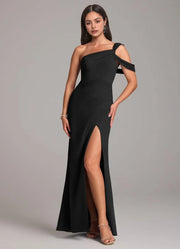 This alluring dress features a sheath silhouette, offering a sleek and body hugging look. The one shoulder neckline exudes unique and bold charm, while the asymmetrical sleeve adds a touch of avant garde style. The open back detail brings a stylish and alluring element, and the floor length skirt with a high side slit creates a truly alluring and unforgettable style, perfect for bridesmaid duties.