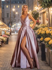 V-Neck Sleeveless Princess Ruched Evening Dresses with Pocket High Split