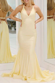 Yellow Mermaid V-Neck Satin With Tail Sleeveless Lace Up Evening Dress Party Dresses Homecoming Dress Prom Dress