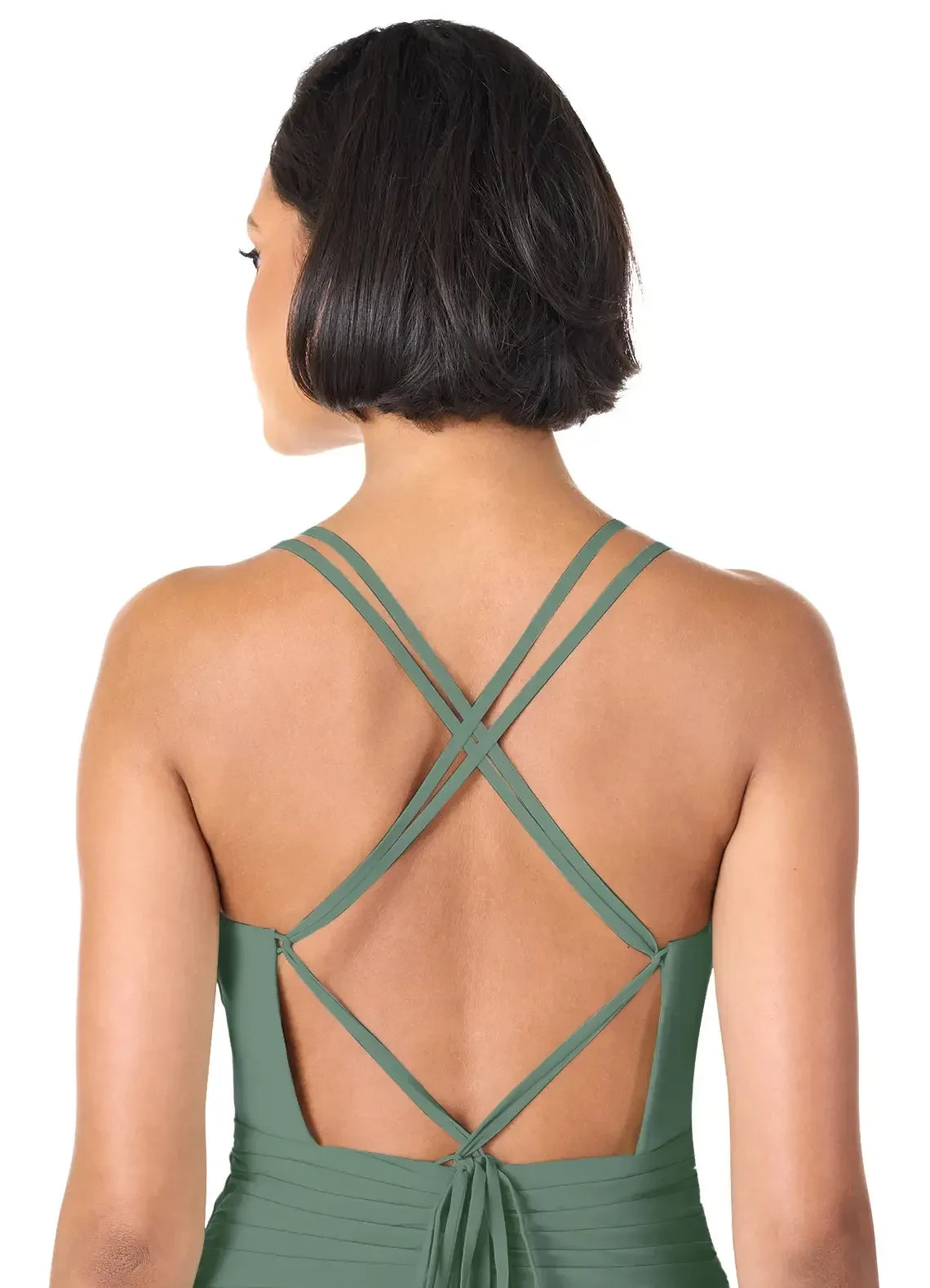 This appealing dress features an A line silhouette, offering a flowy and graceful look. The V neckline exudes romantic and charming vibes, while the sleeveless design adds a touch of elegance. The criss cross back detail brings a stylish and unique element, and the floor length skirt with a high side slit creates a truly appealing and unforgettable style, perfect for bridesmaid duties.