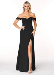 This captivating dress features a mermaid silhouette, offering a sleek and alluring look. The off shoulder neckline exudes romantic and charming vibes, while the short sleeves add a touch of elegance. The bow back detail brings a sweet and stylish element, and the floor length skirt with a high side slit creates a truly captivating and unforgettable style, perfect for bridesmaid duties.