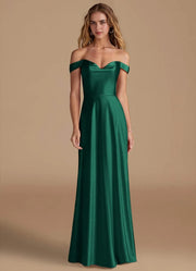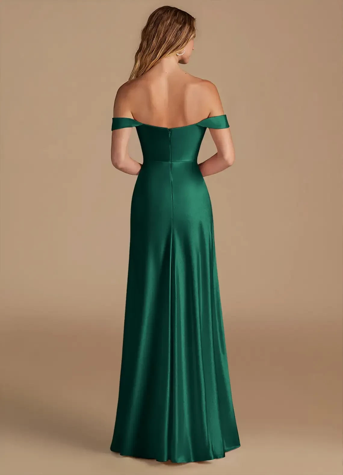 This charming dress features an A line silhouette, offering a flowy and graceful look. The off shoulder neckline exudes romantic and alluring vibes, while the short sleeves add a touch of delicate coverage. The open back detail brings a stylish and chic element, and the floor length skirt creates a truly charming and unforgettable style, perfect for bridesmaid duties.