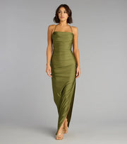 This charming dress features a sheath silhouette, offering a sleek and body hugging look. The cowl neckline exudes a sense of elegant charm, while the spaghetti straps add a touch of delicacy. The crisscross tie back detail brings a stylish and intricate element, and the floor length skirt creates a truly charming and unforgettable style, perfect for bridesmaid duties.