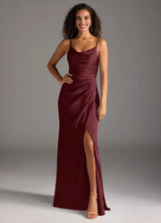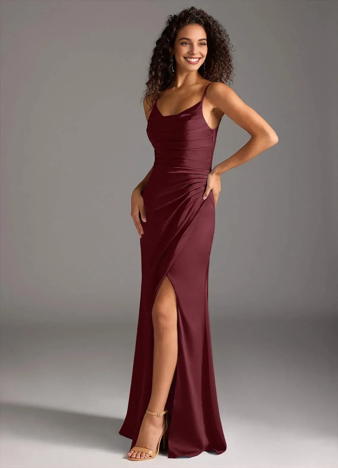 This charming dress features a sheath silhouette, offering a sleek and body hugging look. The sweetheart neckline exudes romantic and gentle vibes, while the spaghetti straps add a touch of delicate and dainty style. The zipper back detail ensures easy wear, and the floor length skirt with a high side slit creates a truly charming and unforgettable style, perfect for bridesmaid duties.