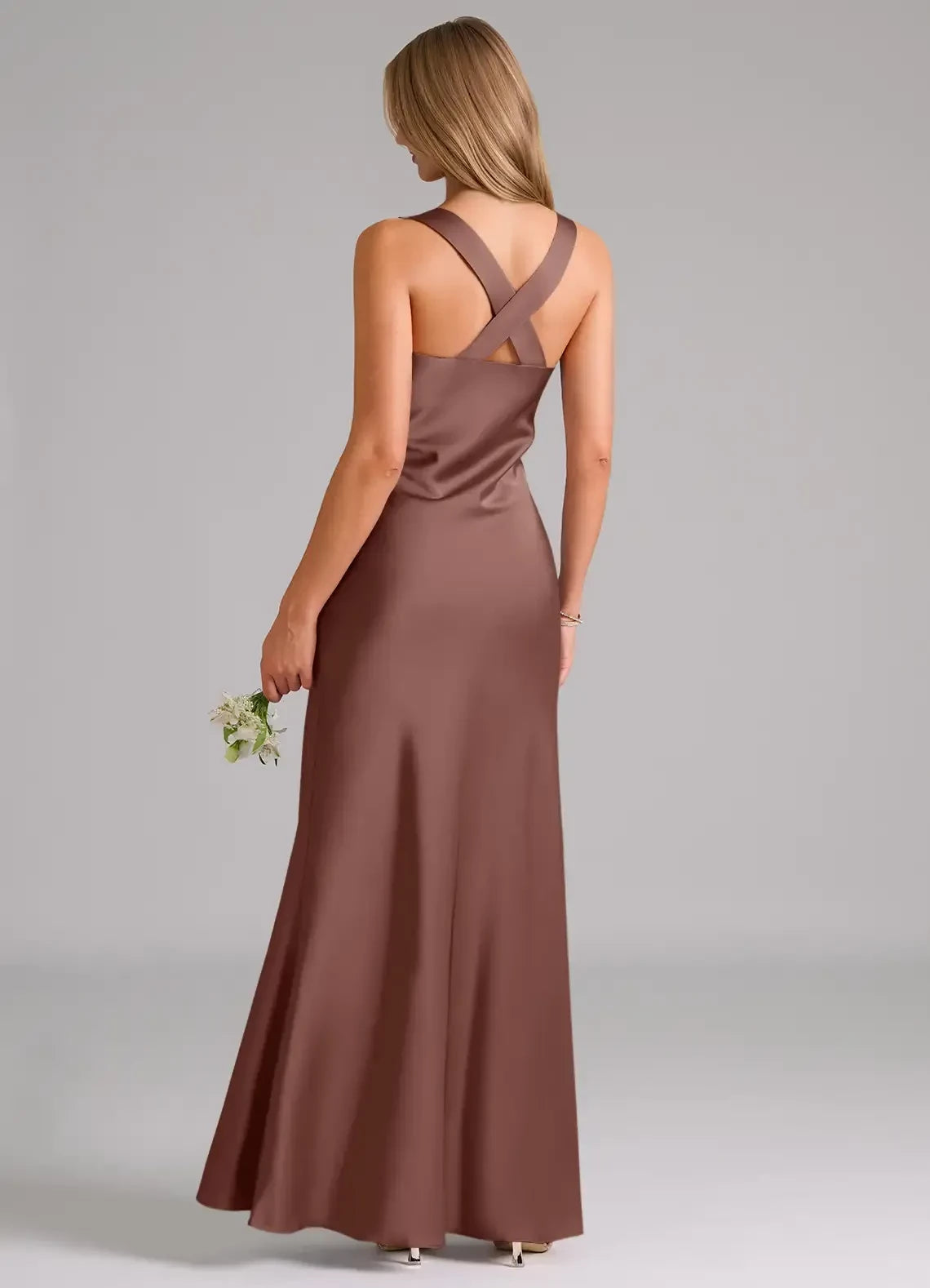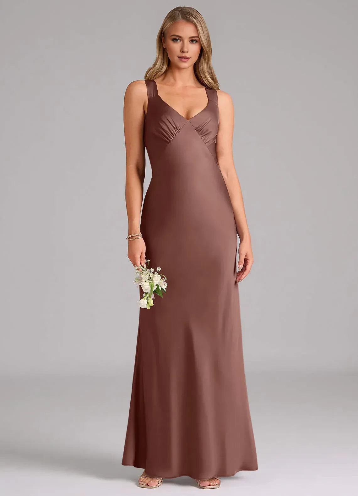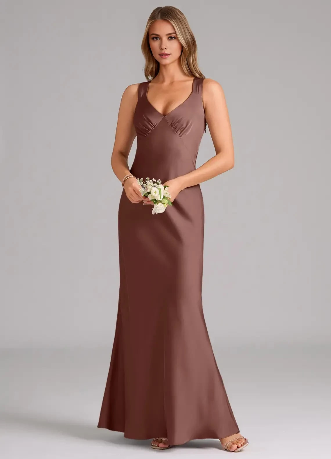 This charming dress features a sheath silhouette, offering a sleek and body hugging look. The V neckline exudes elegant charm, while the sleeveless design adds a touch of modern grace. The criss cross back detail brings a stylish and alluring element, and the floor length skirt creates a truly charming and unforgettable style, perfect for bridesmaid duties.