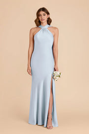 This charming dress features a trumpet silhouette, offering a sleek and elegant look. The halter neckline exudes a sense of sophistication, while the sleeveless design adds a touch of simplicity. The open back detail brings a stylish and alluring element, and the floor length skirt creates a truly charming and unforgettable style, perfect for bridesmaid duties.