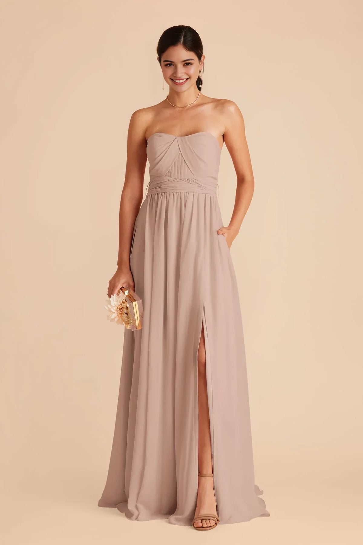 This chic dress features a sheath silhouette, offering a sleek and body hugging look. The strapless neckline exudes bold charm, while the sleeveless design adds a touch of minimalist elegance. The bow back detail brings a stylish and sweet element, and the floor length skirt with a side slit creates a truly chic and unforgettable style, perfect for bridesmaid duties.