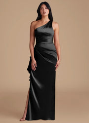 This dazzling dress features a sheath silhouette, offering a sleek and body hugging look. The one shoulder neckline exudes bold and stylish vibes, while the sleeveless design adds a touch of modern simplicity. The zipper back detail ensures easy wear, and the floor length skirt with a high side slit and ruffle accents creates a truly dazzling and unforgettable style, perfect for bridesmaid duties.