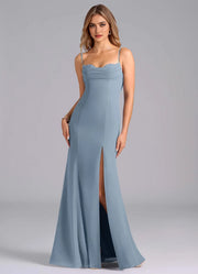 This delicate dress features a sheath silhouette, offering a sleek and body hugging look. The sweetheart neckline exudes tender charm, while the spaghetti straps add a touch of dainty elegance. The lace up back detail brings a stylish and adjustable element, and the floor length skirt with a side slit creates a truly delicate and unforgettable style, perfect for bridesmaid duties.