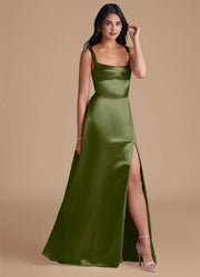 This delightful dress features an A line silhouette, offering a flowy and charming look. The square neckline exudes classic and elegant vibes, while the spaghetti straps add a touch of delicate and dainty style. The zipper back detail ensures easy wear, and the floor length skirt with a high side slit creates a truly delightful and unforgettable style, perfect for bridesmaid duties.