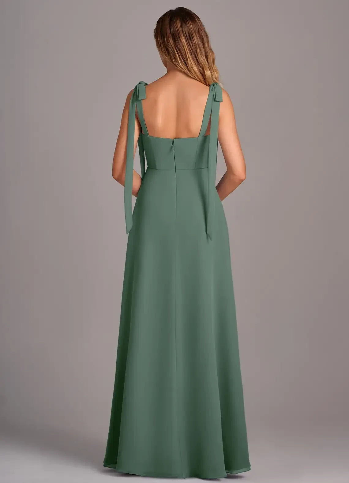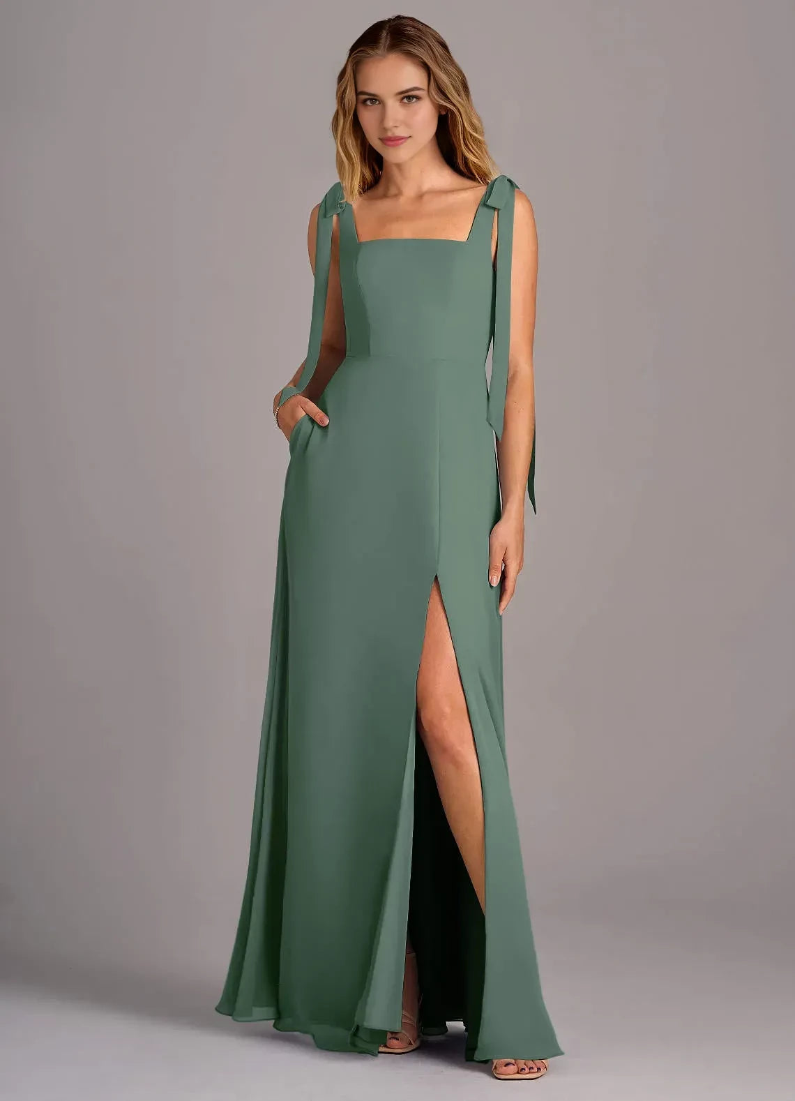 This delightful dress features an A line silhouette, offering a flowy and elegant look. The square neckline exudes classic charm, while the tie straps add a touch of playful and adjustable style. The open back detail brings a stylish and alluring element, and the floor length skirt with a high side slit creates a truly delightful and unforgettable style, perfect for bridesmaid duties.