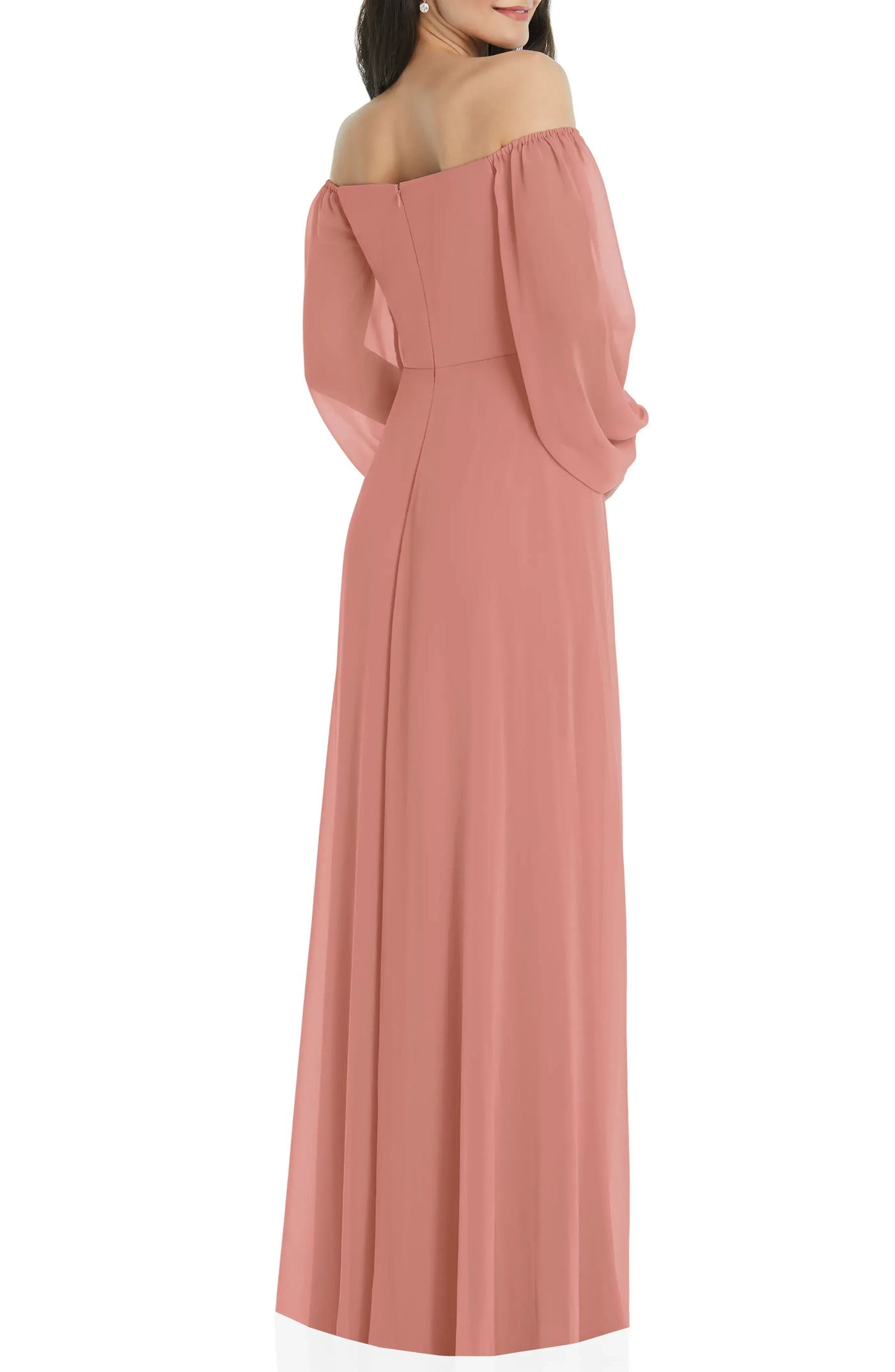 This dreamy dress features an A line silhouette, offering a flowing and graceful fit. The off the shoulder neckline exudes a sense of romance, while the long sleeves add a touch of elegance. The zipper back detail brings a practical and stylish element, and the floor length skirt creates a truly dreamy and unforgettable style, perfect for bridesmaid duties.