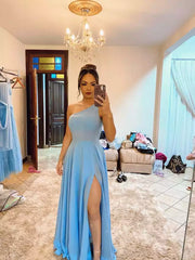 This elegant blue prom dress features a sophisticated one-shoulder design and a sleeveless cut, offering a modern and flattering silhouette. The thigh-high slit adds a touch of allure while ensuring ease of movement, making it an ideal choice for bridesmaids or formal occasions. Crafted to combine style and comfort, this dress enhances your presence with its graceful lines and vibrant color.