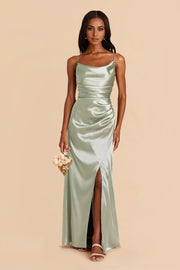 This elegant dress features a sheath silhouette, offering a sleek and body hugging look. The cowl neckline exudes soft charm, while the spaghetti straps add a touch of delicate elegance. The open back detail brings a stylish and alluring element, and the floor length skirt with a side slit creates a truly elegant and unforgettable style, perfect for bridesmaid duties.