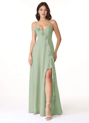 This enchanting dress features an A line silhouette, offering a flowy and graceful look. The V neckline exudes romantic and alluring vibes, while the spaghetti straps add a touch of delicate and dainty style. The crisscross back detail brings a stylish and unique element, and the floor length skirt with a ruffled side slit creates a truly enchanting and unforgettable style, perfect for bridesmaid duties.