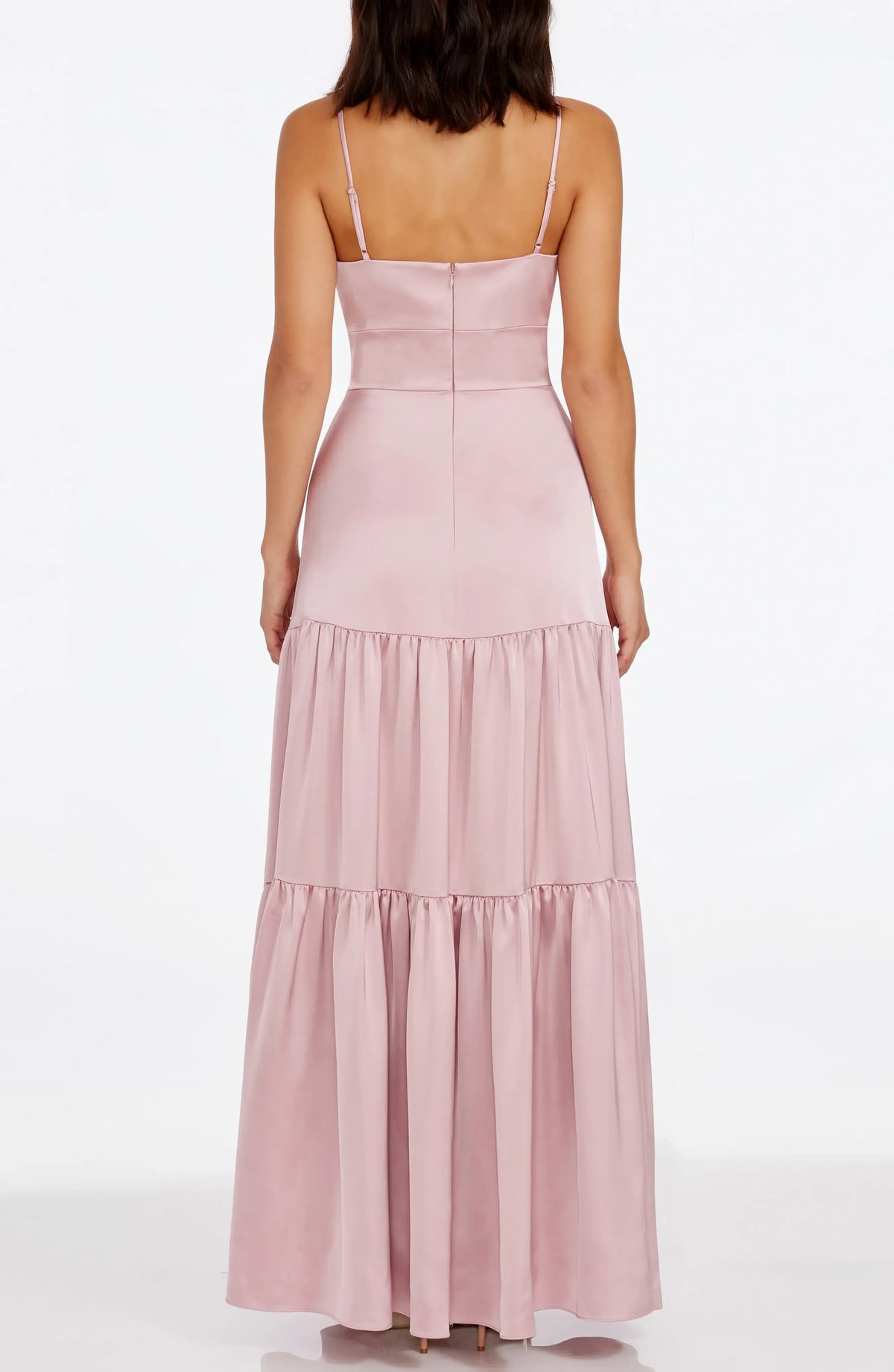 This enchanting dress features an A line silhouette, offering a flowing and feminine fit. The V neckline radiates a sense of romance, while the spaghetti strap design adds a touch of delicate charm. The zipper back detail brings a stylish and practical element, and the floor length skirt creates a truly enchanting and unforgettable style, perfect for bridesmaid duties.