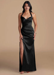 This enchanting dress features a sheath silhouette, offering a sleek and body hugging look. The halter neckline exudes bold and captivating vibes, while the sleeveless design adds a touch of modern simplicity. The cutout back detail brings a stylish and alluring element, and the floor length skirt with a high side slit creates a truly enchanting and unforgettable style, perfect for bridesmaid duties.