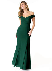 This glamorous dress showcases a mermaid silhouette, hugging curves to create a stunning look. The off shoulder neckline exudes romantic and alluring vibes, while the cap sleeves add a touch of elegance. The zipper back detail ensures a secure and neat fit, and the floor length skirt creates a truly glamorous and unforgettable style, perfect for bridesmaid duties.