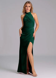 This gorgeous dress features a sleek silhouette, offering a body hugging look. The halter neckline exudes elegant charm, while the sleeveless design adds a touch of modern grace. The open back detail brings a stylish and alluring element, and the floor length skirt with a high side slit creates a truly gorgeous and unforgettable style, perfect for bridesmaid duties.
