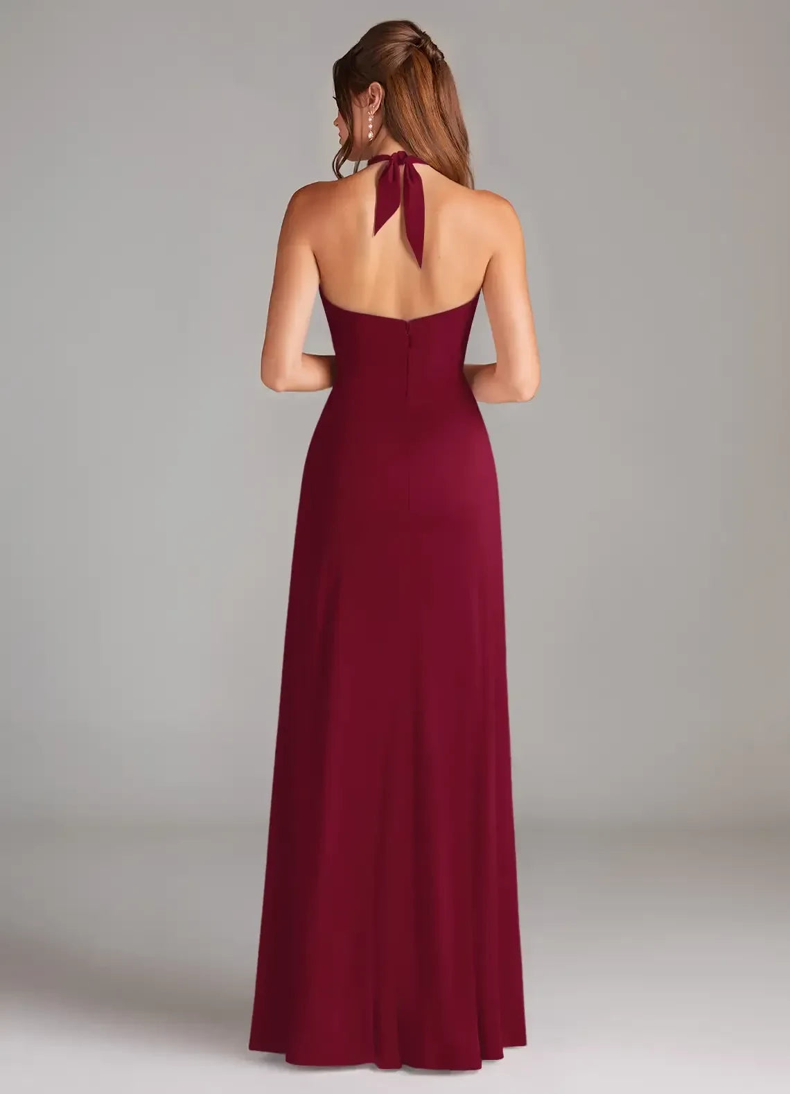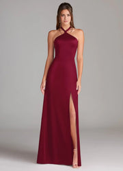 This gorgeous dress features a sleek silhouette, offering a body hugging and elegant look. The halter neckline exudes alluring charm, while the sleeveless design adds a touch of modern simplicity. The tie back detail brings a stylish and adjustable element, and the floor length skirt with a high side slit creates a truly gorgeous and unforgettable style, perfect for bridesmaid duties.