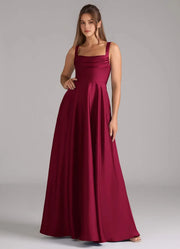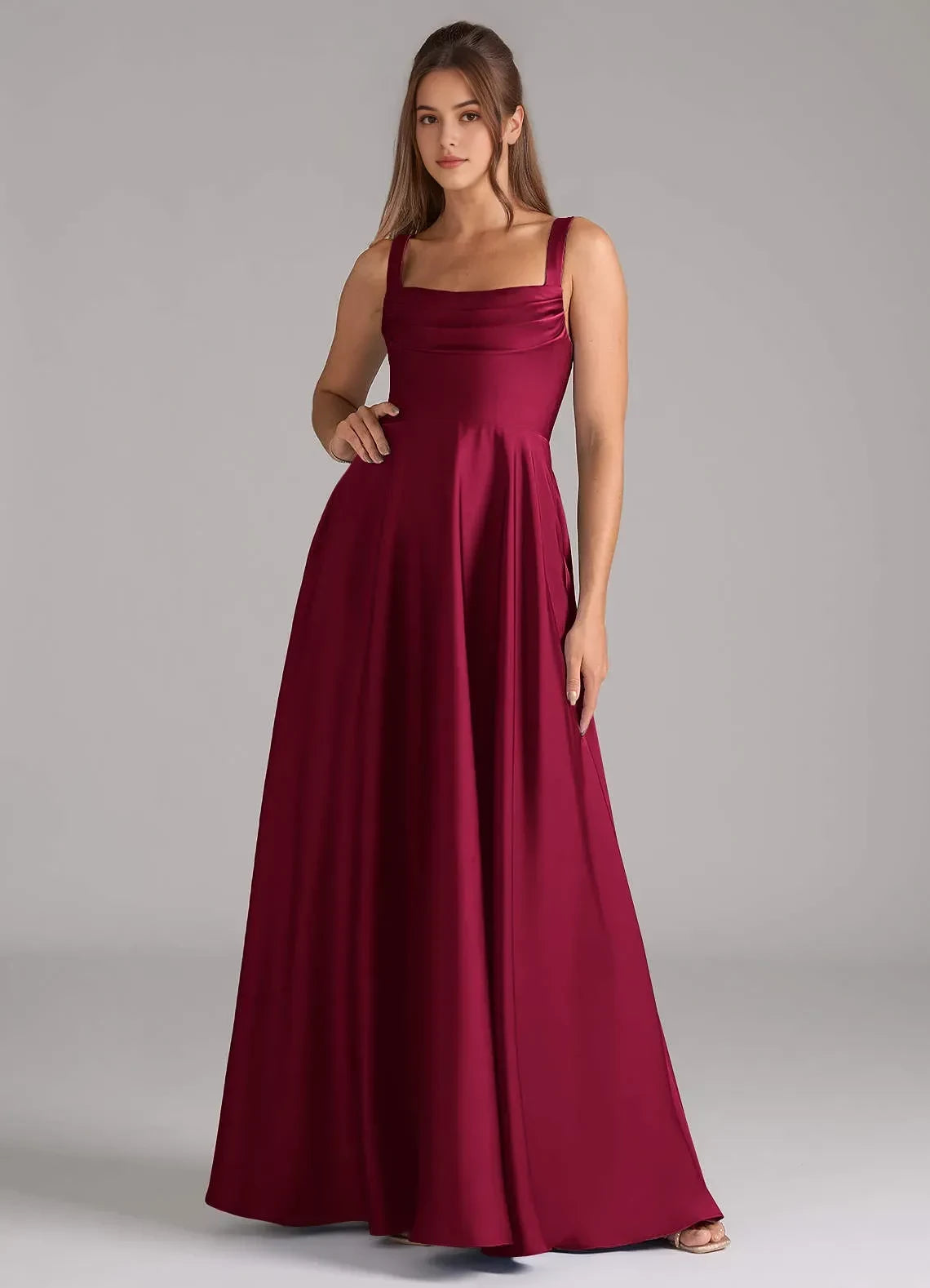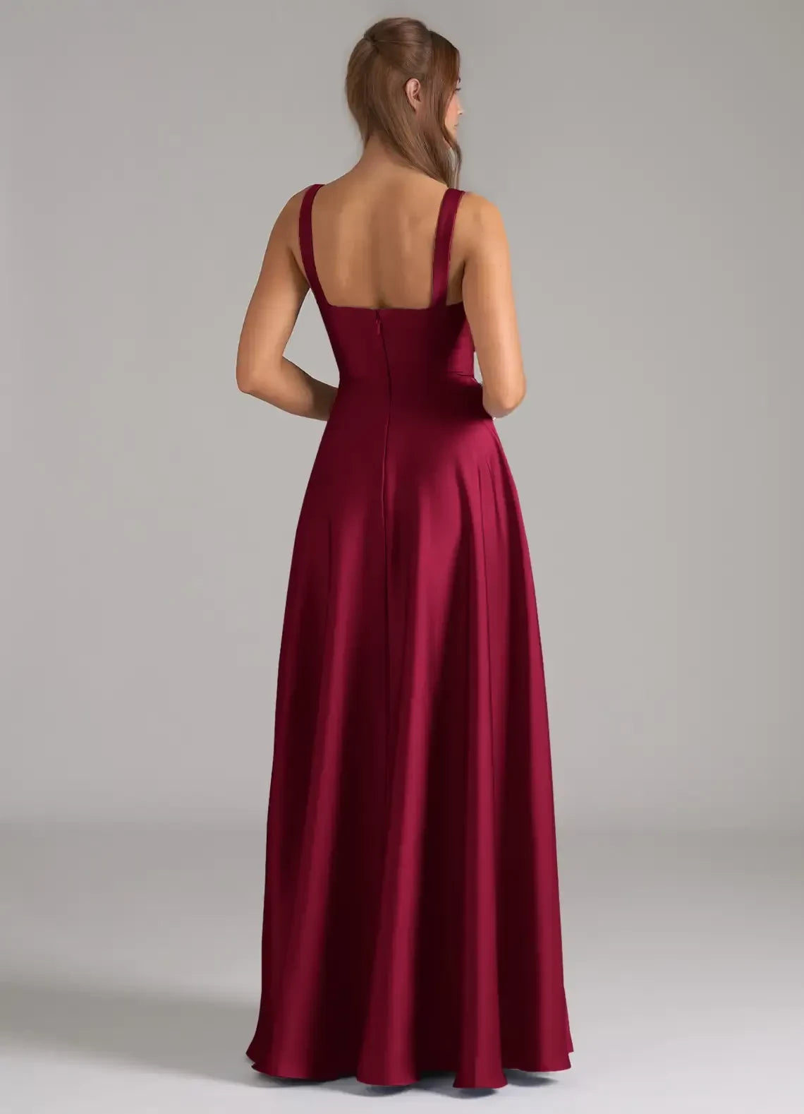 This graceful dress features an A line silhouette, offering a flowy and elegant look. The square neckline exudes classic charm, while the sleeveless design adds a touch of modern simplicity. The zipper back detail brings a practical and stylish element, and the floor length skirt creates a truly graceful and unforgettable style, perfect for bridesmaid duties.