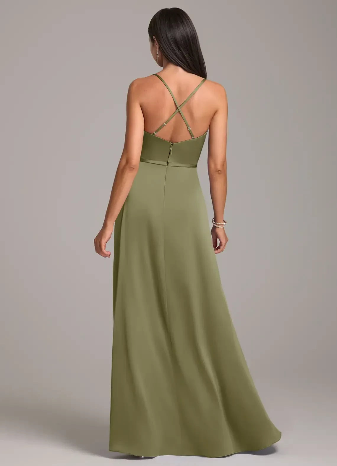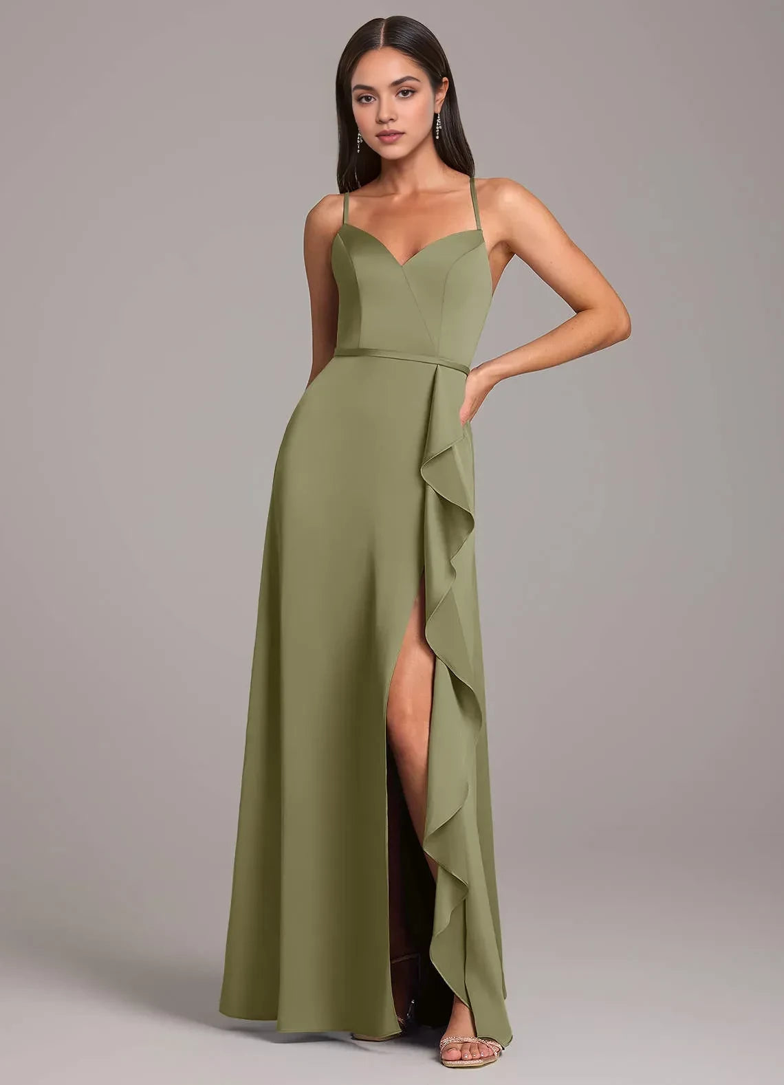This graceful dress features an A line silhouette, offering a flowy and elegant look. The sweetheart neckline exudes romantic charm, while the spaghetti straps add a touch of delicate elegance. The criss cross back detail brings a stylish and alluring element, and the floor length skirt with a high side slit creates a truly graceful and unforgettable style, perfect for bridesmaid duties.