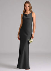 This graceful dress features a sheath silhouette, offering a sleek and body hugging look. The cowl neckline exudes soft and elegant charm, while the sleeveless design adds a touch of modern grace. The zipper back detail brings a practical and stylish element, and the floor length skirt creates a truly graceful and unforgettable style, perfect for bridesmaid duties.