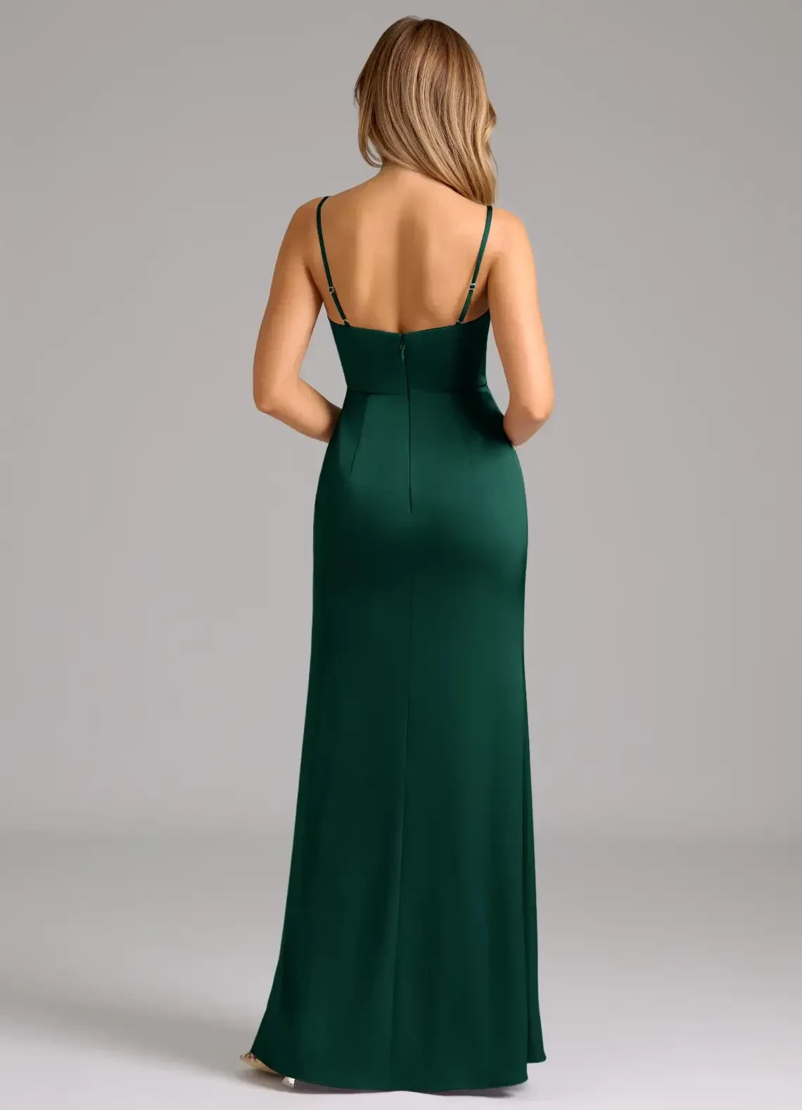 This graceful dress features a sheath silhouette, offering a sleek and body hugging look. The cowl neckline exudes soft and elegant charm, while the spaghetti straps add a touch of delicate style. The open back detail brings a stylish and alluring element, and the floor length skirt creates a truly graceful and unforgettable style, perfect for bridesmaid duties.