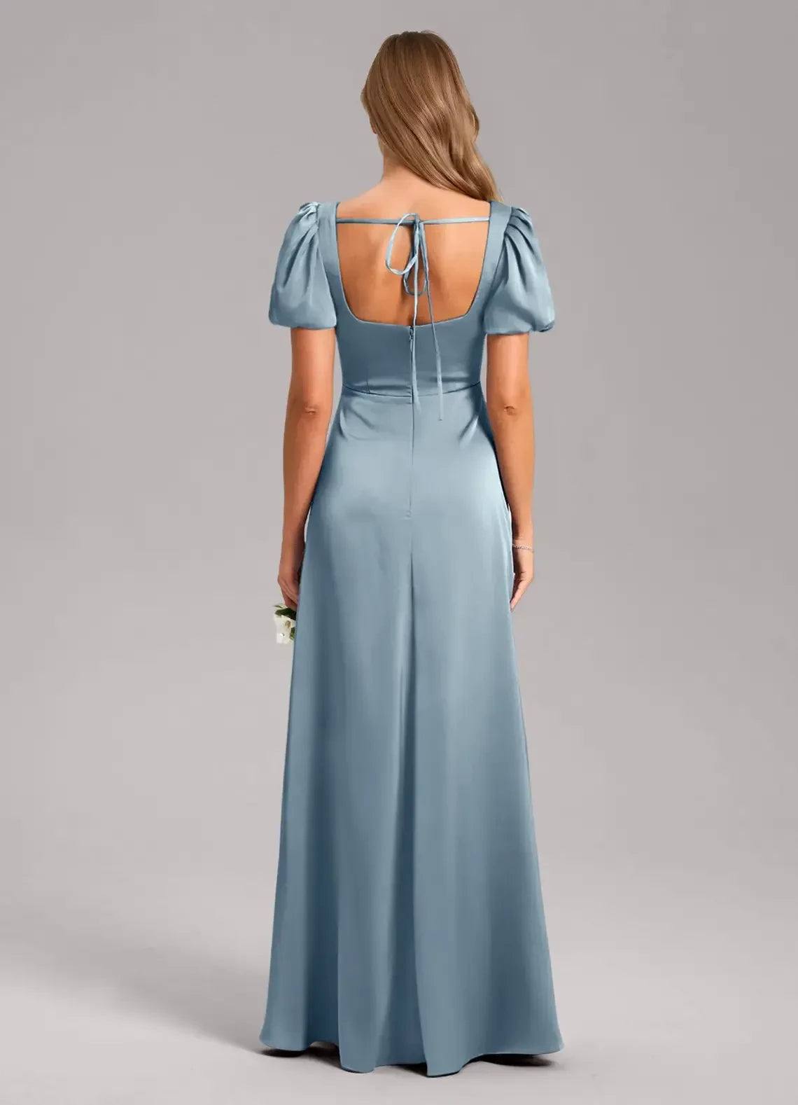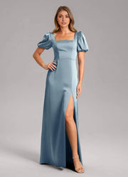 This lovely dress features a sheath silhouette, offering a sleek and body hugging look. The square neckline exudes classic charm, while the puff short sleeves add a touch of sweet and romantic style. The tie back detail brings a stylish and adjustable element, and the floor length skirt with a high side slit creates a truly lovely and unforgettable style, perfect for bridesmaid duties.