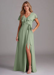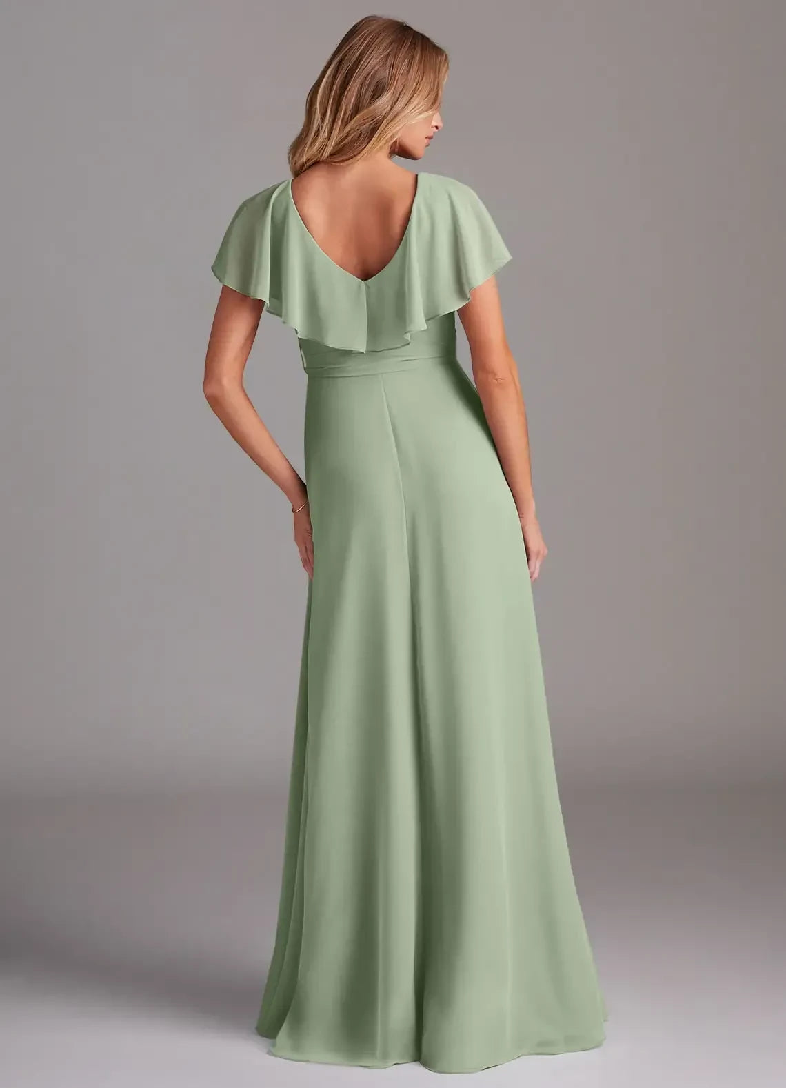 This pretty dress features an A line silhouette, offering a flowy and graceful look. The V neckline exudes charming and elegant vibes, while the flutter sleeves add a touch of delicate and airy style. The open back detail brings a stylish and alluring element, and the floor length skirt with a high side slit creates a truly pretty and unforgettable style, perfect for bridesmaid duties.