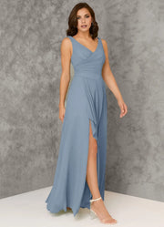 This radiant dress features an A line silhouette, offering a flowy and graceful look. The V neckline exudes romantic and charming vibes, while the sleeveless design adds a touch of elegance. The zipper back detail brings a practical and neat element, and the floor length skirt with a high side slit creates a truly radiant and unforgettable style, perfect for bridesmaid duties.