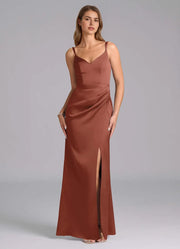 This radiant dress features a sheath silhouette, offering a sleek and body hugging look. The V neckline exudes charming and elegant vibes, while the spaghetti straps add a touch of delicate and dainty style. The zip back detail ensures easy wear, and the floor length skirt with a high side slit creates a truly radiant and unforgettable style, perfect for bridesmaid duties.