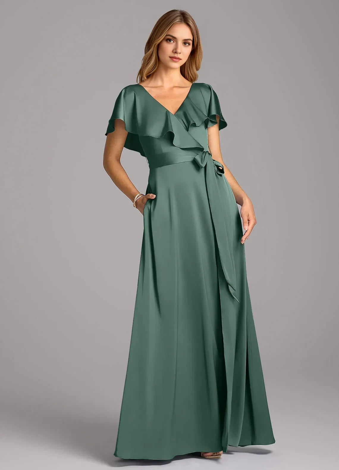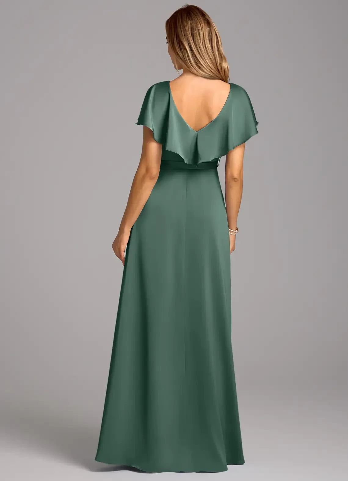 This romantic dress features an A line silhouette, offering a flowy and elegant look. The V neckline exudes alluring charm, while the ruffled sleeves add a touch of delicate movement. The V back detail brings a stylish and graceful element, and the floor length skirt creates a truly romantic and unforgettable style, perfect for bridesmaid duties.