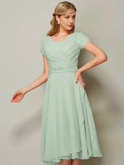 Short Sleeves Sheath Chiffon Bateau Tea-Length With Ruffles Bridesmaid Dresses