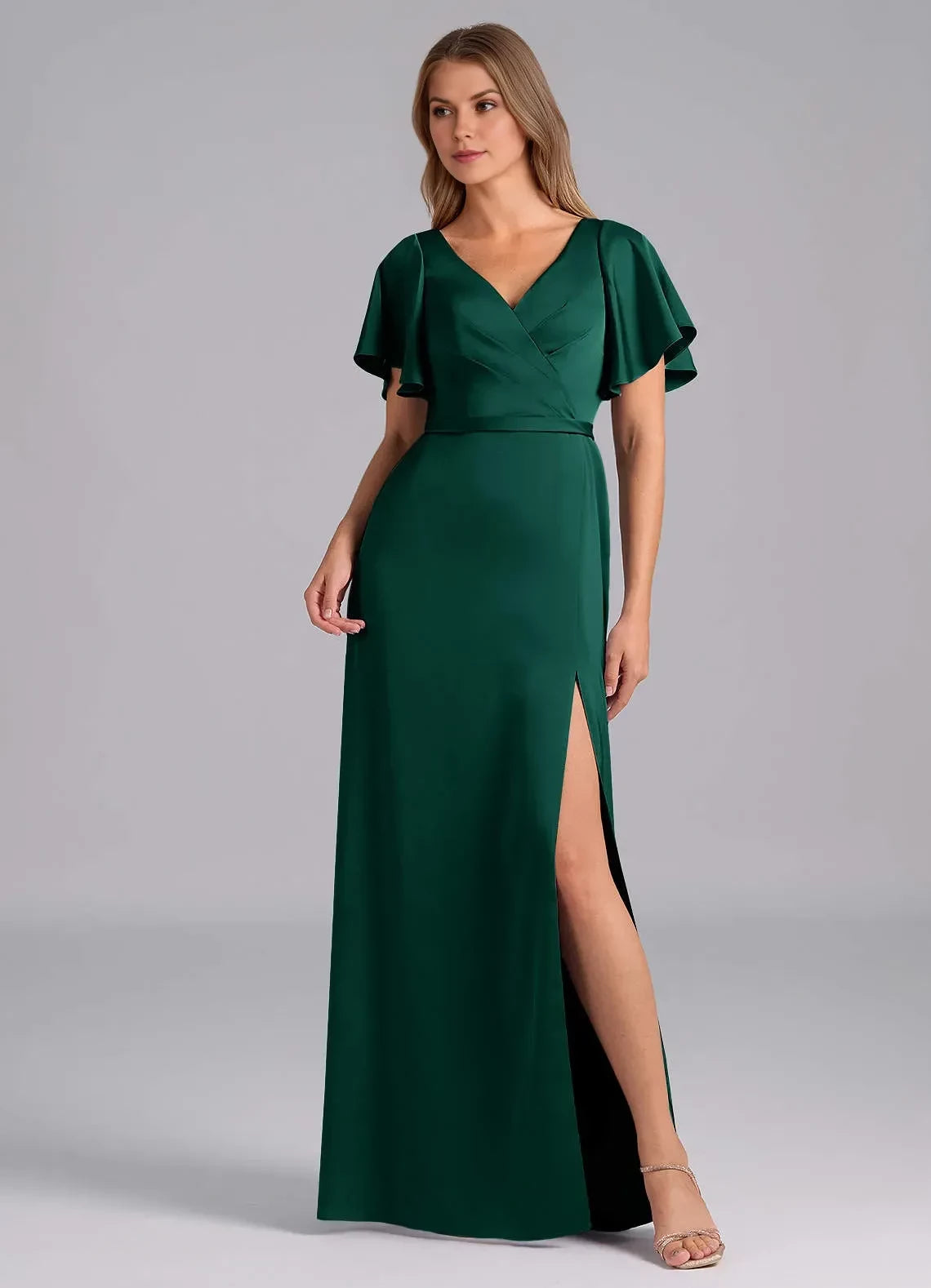 This sophisticated dress features an A line silhouette, offering a flowy and flattering look. The V neckline exudes refined charm, while the flutter sleeves add a touch of gentle elegance. The V back detail brings a stylish and graceful element, and the floor length skirt with a side slit creates a truly sophisticated and unforgettable style, perfect for bridesmaid duties.