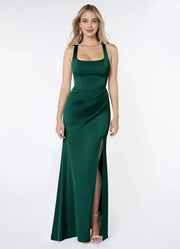 This splendid dress features a sheath silhouette, offering a sleek and body hugging look. The square neckline exudes classic and refined vibes, while the sleeveless design adds a touch of modern simplicity. The knot back detail brings a stylish and unique element, and the floor length skirt with a high side slit creates a truly splendid and unforgettable style, perfect for bridesmaid duties.