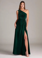 This stunning dress features an A line silhouette, offering a flowy and graceful look. The one shoulder neckline exudes unique charm, while the sleeveless design adds a touch of modern elegance. The open back detail brings a stylish and alluring element, and the floor length skirt with a high side slit creates a truly stunning and unforgettable style, perfect for bridesmaid duties.