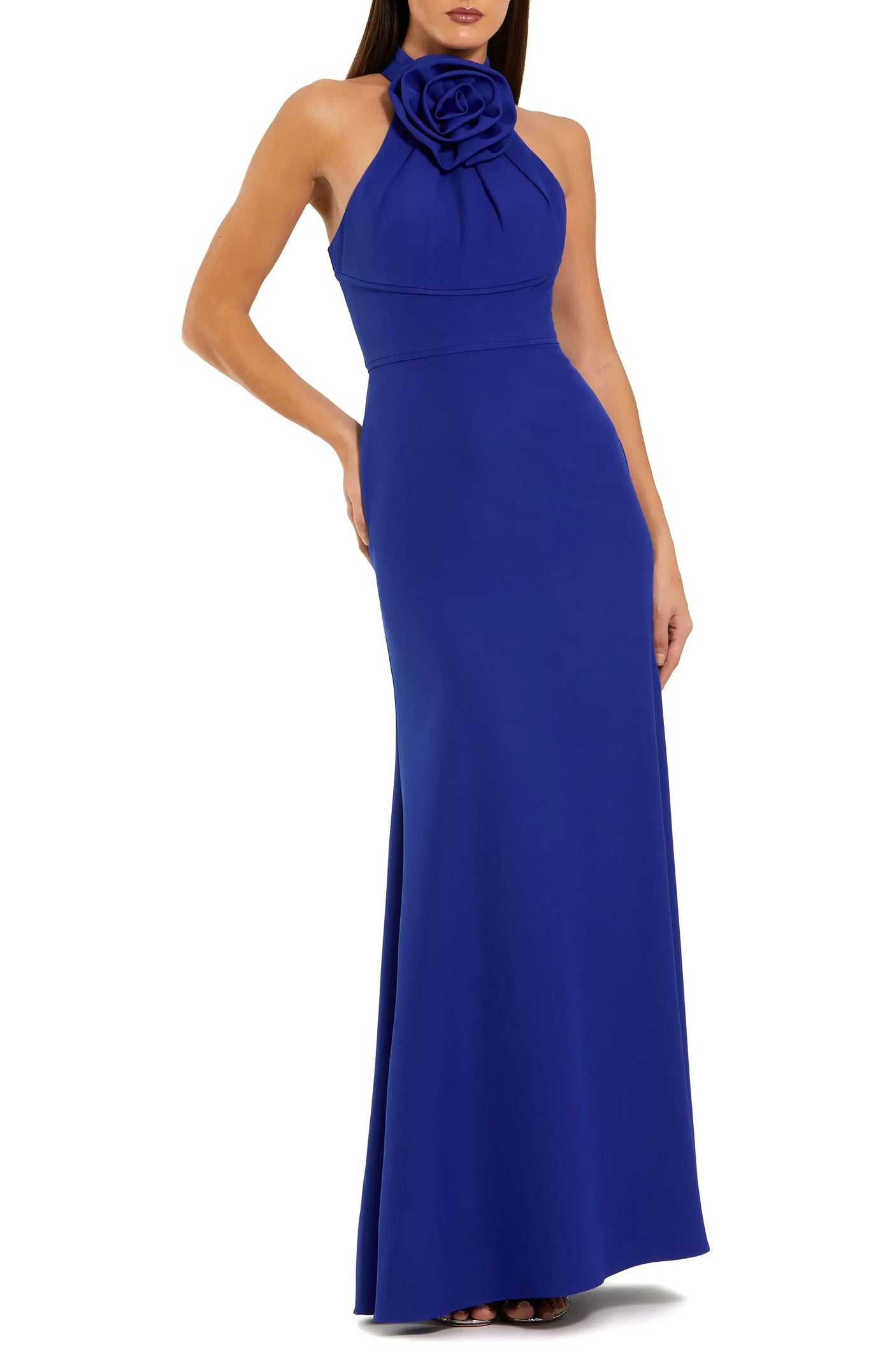 This stunning dress features a sheath silhouette, hugging the body beautifully to highlight curves. The halter neckline, adorned with a flower detail, gives off a charming and eye catching vibe. With a sleeveless design, it adds a touch of delicate charm. The zipper back detail brings a practical and stylish element, and the floor - length skirt creates a truly stunning and unforgettable style, perfect for bridesmaid duties.