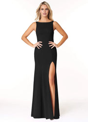 This stylish dress features a mermaid silhouette, offering a sleek and body hugging look that flares at the bottom. The boat neckline exudes classic and refined vibes, while the sleeveless design adds a touch of elegance. The zipper back detail brings a practical and neat element, and the floor length skirt with a high side slit creates a truly stylish and unforgettable style, perfect for bridesmaid duties.