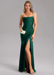 This stylish dress features a sheath silhouette, offering a sleek and body hugging look. The cowl neckline exudes soft and elegant charm, while the spaghetti straps add a touch of delicate style. The criss cross tie back detail brings a stylish and adjustable element, and the floor length skirt with a high side slit creates a truly stylish and unforgettable style, perfect for bridesmaid duties.