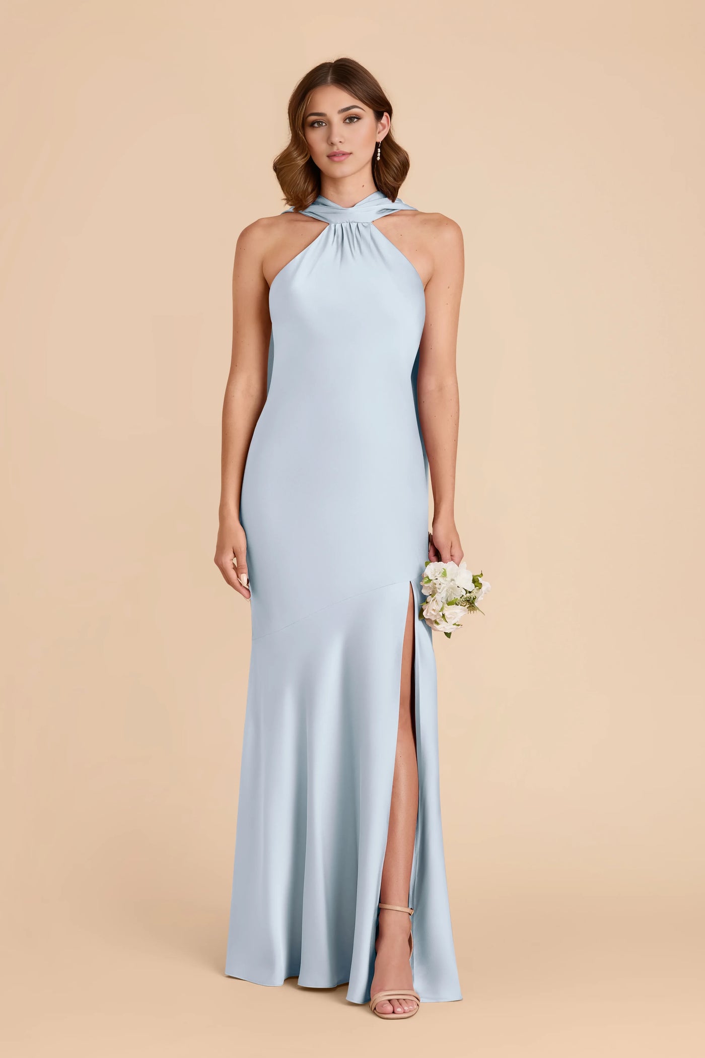 This stylish dress features a sheath silhouette, offering a sleek and body hugging look. The halter neckline exudes chic charm, while the sleeveless design adds a touch of modern elegance. The open back detail brings a stylish and alluring element, and the floor length skirt creates a truly stylish and unforgettable style, perfect for bridesmaid duties.