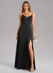 This stylish dress features a sheath silhouette, offering a sleek and body - hugging look. The V neckline exudes chic charm, while the spaghetti straps add a touch of delicate style. The open back detail brings a stylish and alluring element, and the floor length skirt with a high side slit creates a truly stylish and unforgettable style, perfect for bridesmaid duties.