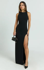 This evening dress features a bodycon silhouette. It has a high neckline with sleeveless design. The crisscross-back detail, floor-length cut with high slit, and plus-size option bring alluring charm, making it ideal for evening events. The structured bodice and figure-hugging design create a captivating and bold evening look.