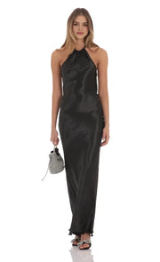 This alluring dress features a sheath silhouette, offering a sleek and body hugging look. The halter neckline exudes chic charm, while the sleeveless design adds a touch of airy elegance. The open back detail brings a captivating element, and the floor length skirt with a shimmering fabric creates a truly alluring and unforgettable style, perfect for evening events.