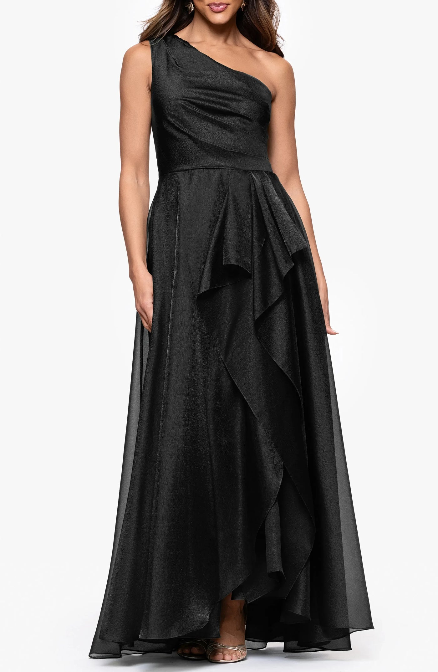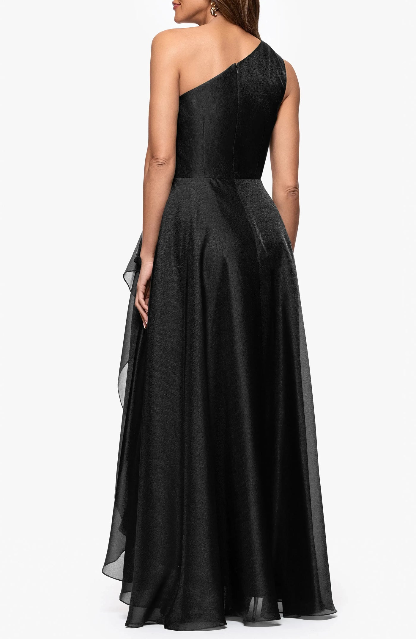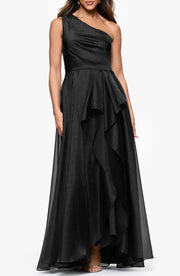 This captivating dress features an A line silhouette, offering a flowing and comfortable fit. The one shoulder design brings a bold and stylish charm. With a sleeveless cut, it adds a touch of allure. The zipper back detail ensures a secure and sleek fit, and the floor length skirt makes for a truly captivating and unforgettable appearance, perfect for evening events.